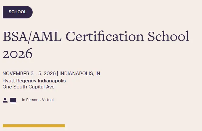 We’re excited to serve as the official emcee for the BSA/AML Certification School 2026, hosted by America’s Credit Unions. This intensive program runs November 3-5, 2026, in Indianapolis, Indiana, with both in-person and virtual attendance options available.